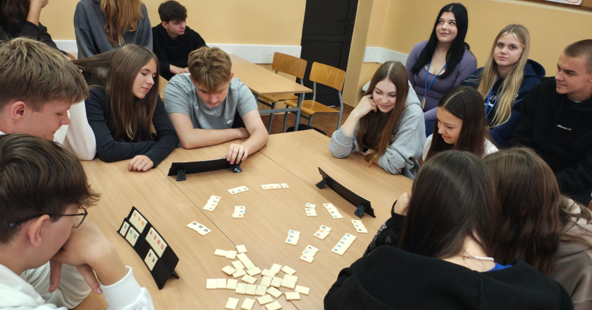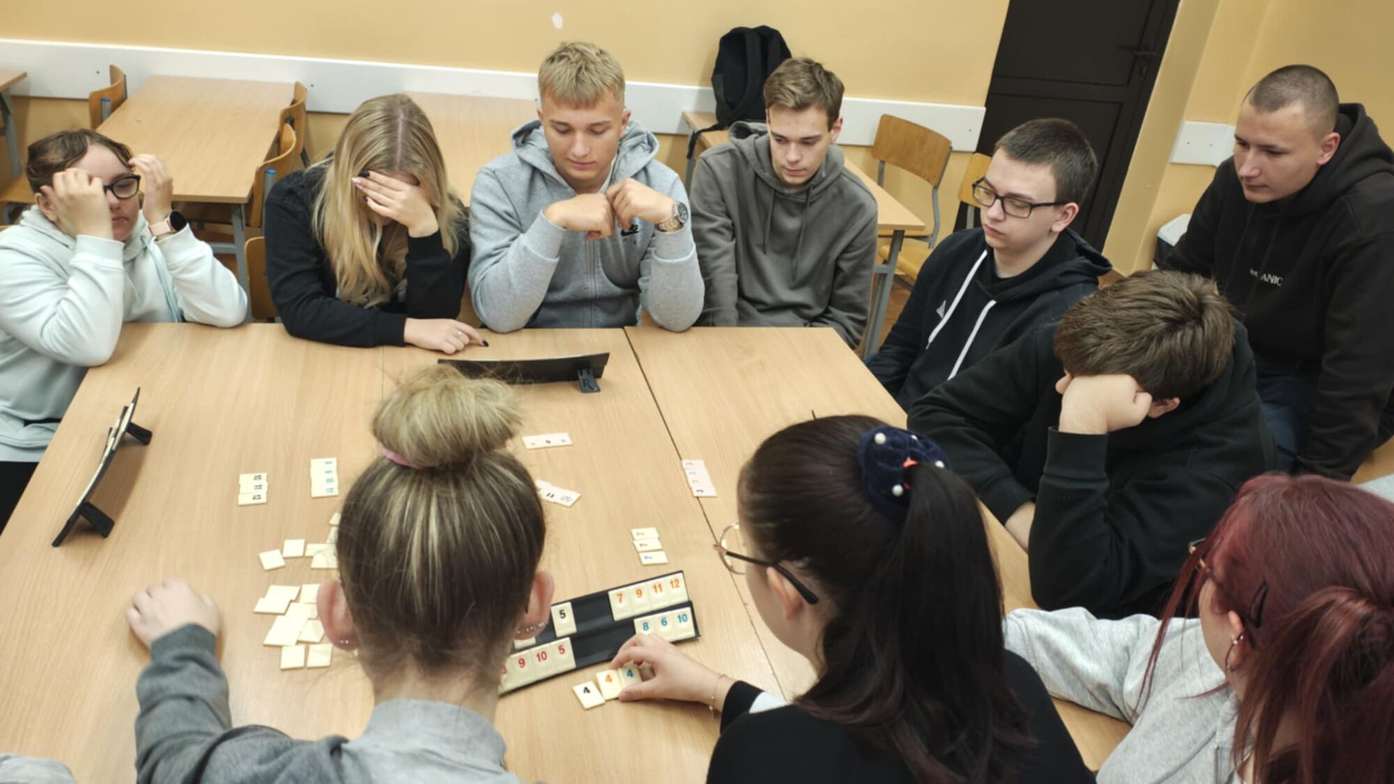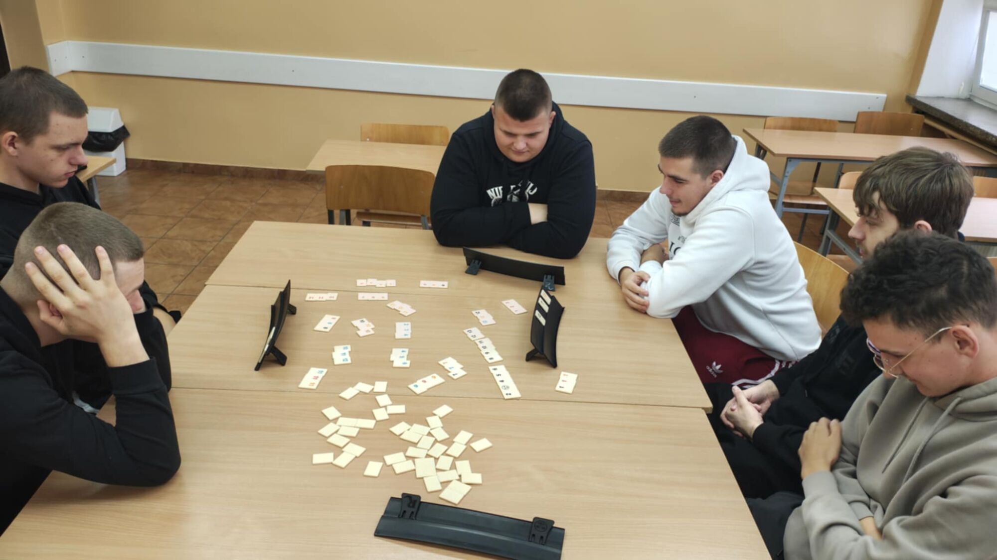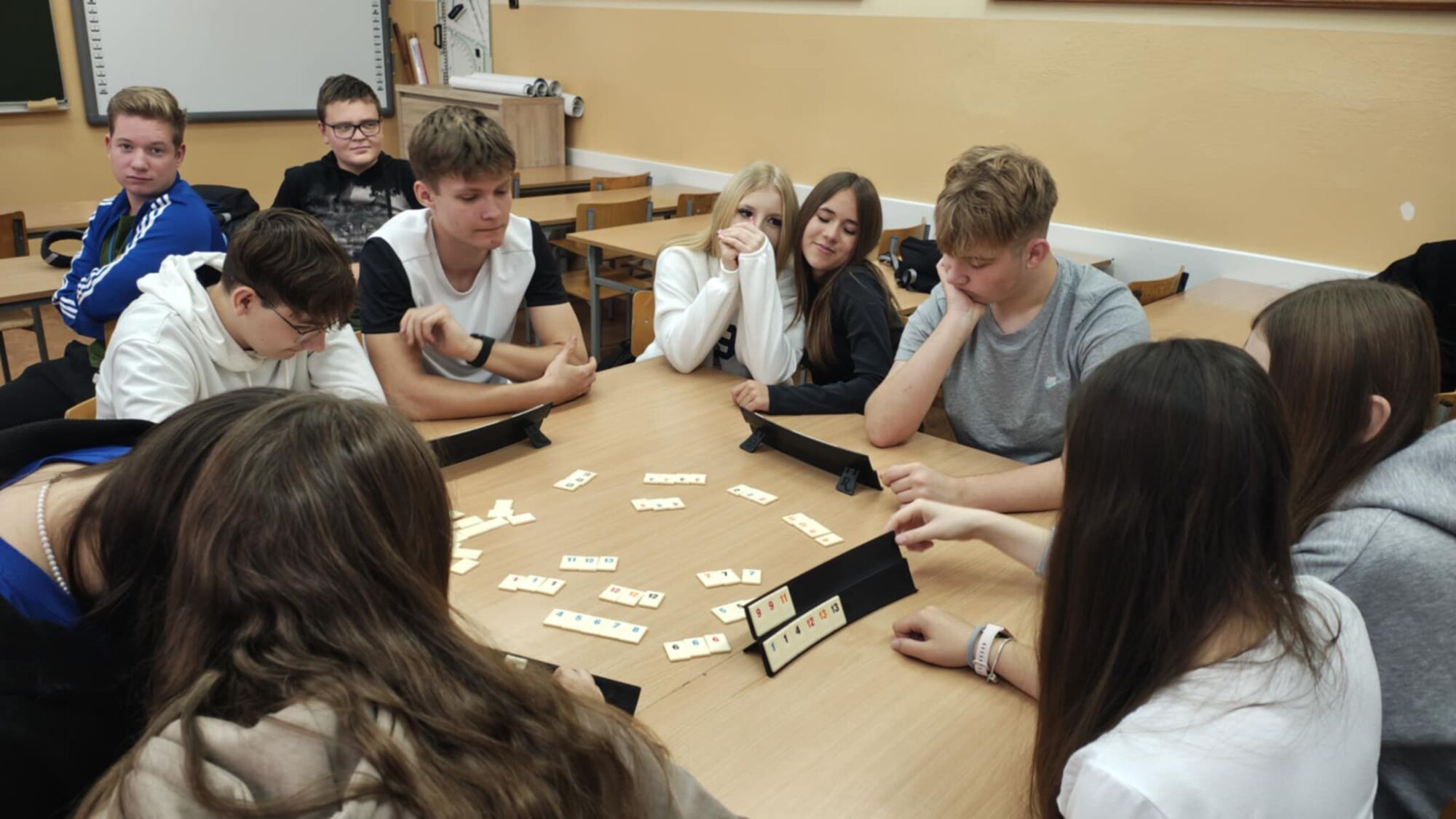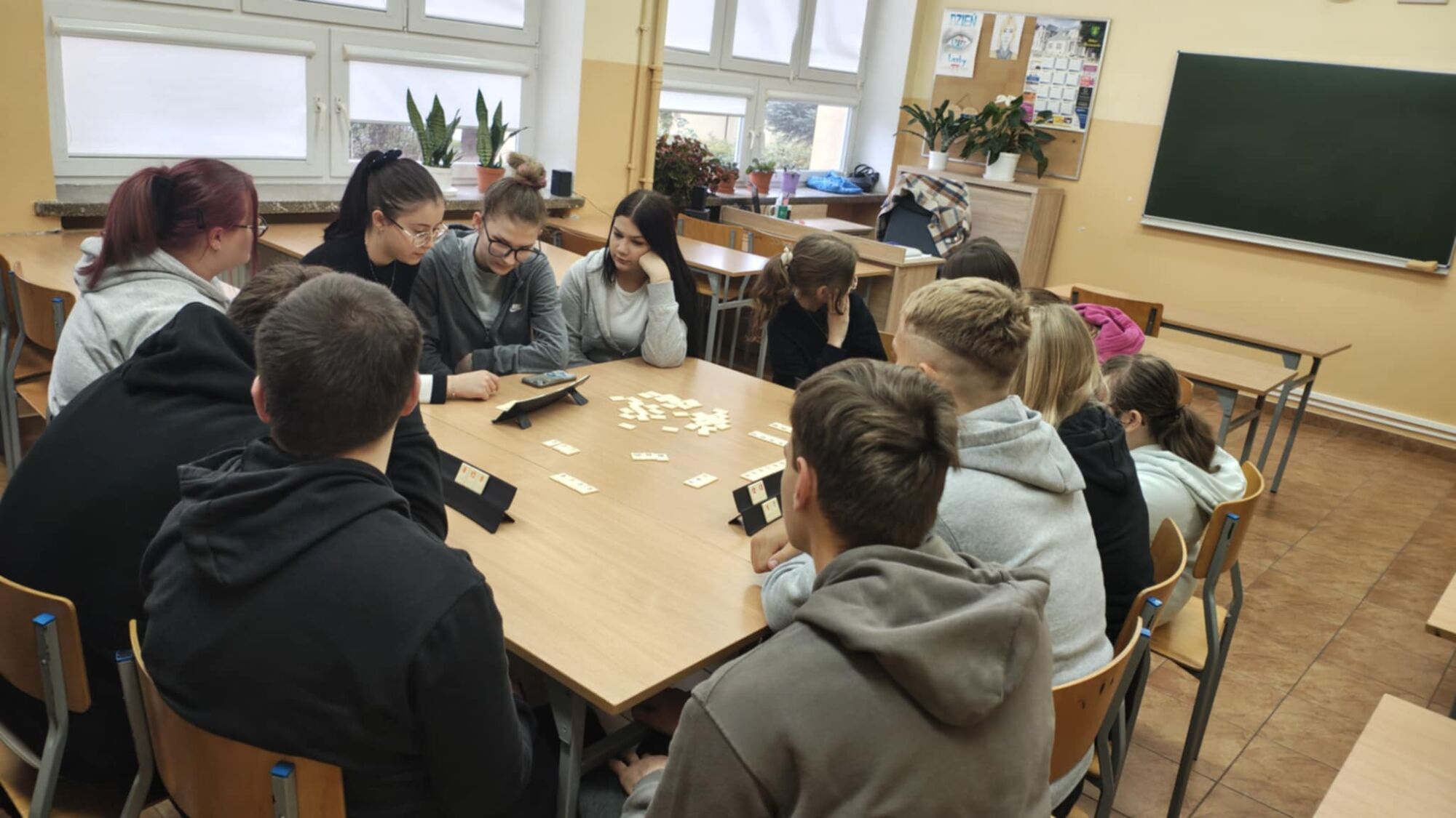 Dziś obchodziliśmy Dzień Gier Planszowych. Uczniowie mieli okazję spędzić czas w miłej atmosferze, rozwijając logiczne myślenie i umiejętność współpracy. Graliśmy między innymi w Rummikub – grę wymagającą strategii, spostrzegawczości i planowania. Rozgrywki dostarczyły nam wiele emocji, a uczestnicy z zaangażowaniem rywalizowali o zwycięstwo. Okazało się, że grając w warcaby, szachy czy chińczyka można równie emocjonująco spędzić czas jak przed komputerem. Scrabble zaskoczyły nie tylko umiejętnością tworzenia słów, ale pomysłowością i strategią. To był miły dzień spędzony na integracjach klasowych.