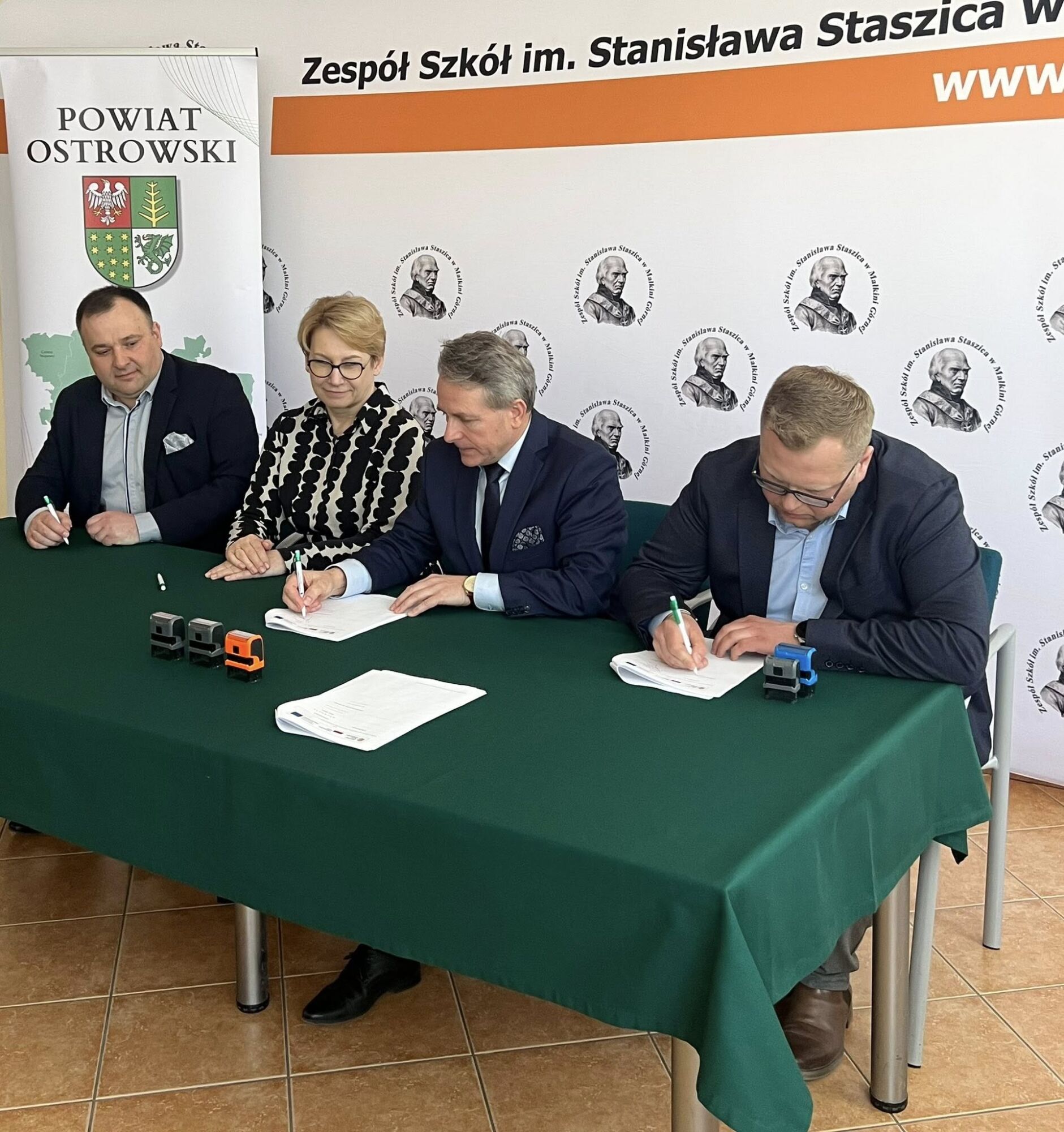 Umowę podpisali Starosta Ostrowski Jerzy Bauer, Wicestarosta Bartłomiej Tomasz Pieńkowski, Skarbnik Powiatu Małgorzata Konrad oraz Wykonawca inwestycji Tomasz Gajewski.