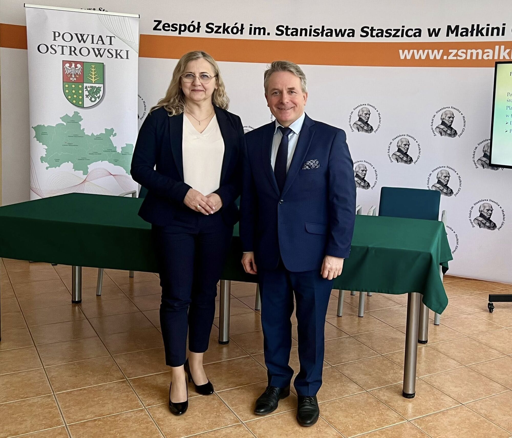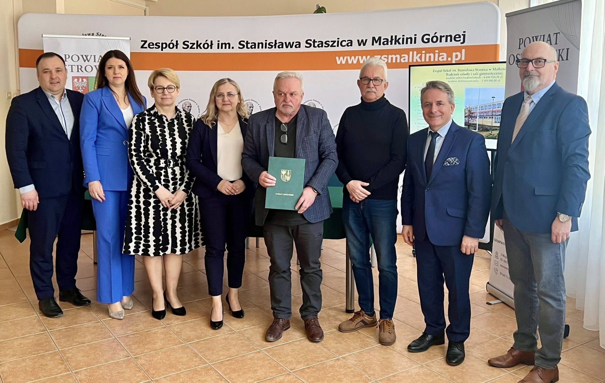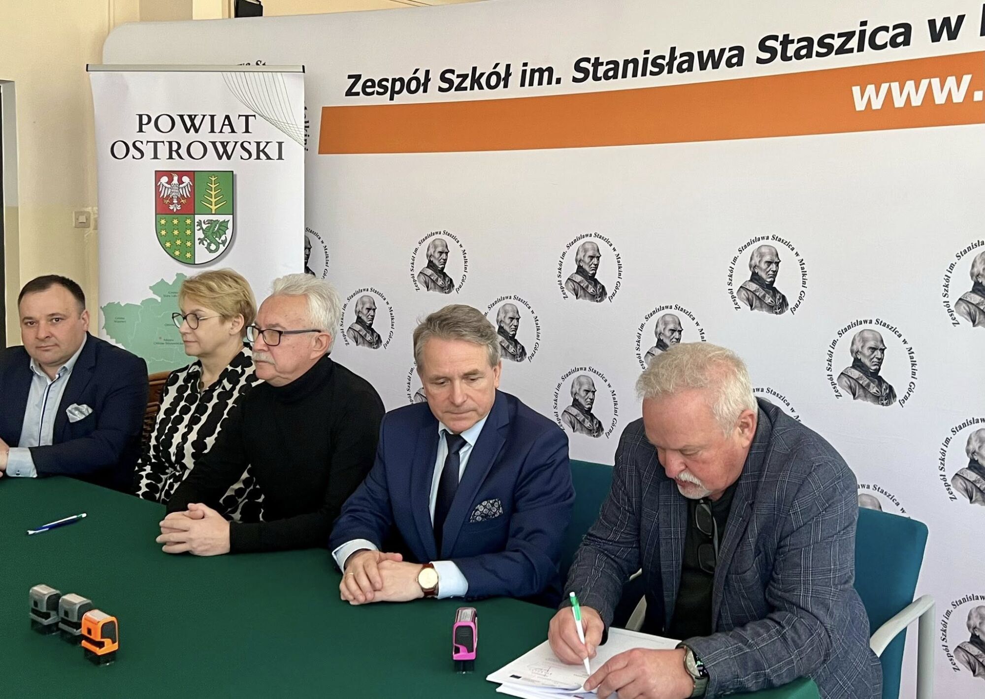 Przy podpisaniu umów obecni byli również Dyrektor Wydziału Inwestycji i Zamówień Publicznych Starostwa Powiatowego w Ostrowi Mazowieckiej Urszula Waniewska, Dyrektor Zespołu Szkół im. Stanisława Staszica w Małkini Górnej Agnieszka Gaś oraz wicedyrektor szkoły Adam Przesmycki.